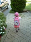 Got her backpack on and she started down the steps. I turned to lock the door and when I turned around she was at the sidewalk beginning to walk the route we take every morning to Katrine’s bus stop. “Elspeth, where are you going?” “I go little bus mama. Go school.” I felt so bad when I had to explain to her that we would be traveling by car not bus. The damage to her spirits was temporary as once we arrived at the parking lot she was ready to go again.