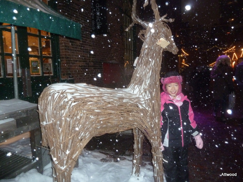 Last night we took Glenn’s mom with us on a festive outing downtown to the Christmas Market. We went last year but thought that it would be a nice family outing which it was. The lights are truly beautiful and all of the snow last night made them even more so. Imagine walking along to the sound of christmas music amidst a swirl of snowflakes as lights dance in the breeze over head. Oh, and there is a huge tree and tons of festive decorations.